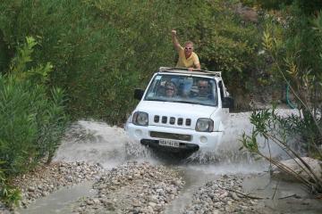 We offer you a drive through the mountains of the island! We have a full day planned off-roads for you to enjoy while on holiday. It will be bumpy, there will be dust and you may get wet. We will drive through the mountains, pass small villages, go through a riverbed, enjoy nature and have a lot of fun. On the way we will stop several times, for a drink, for our picnic (just order it on the way) and also for swimming on a nice beach!